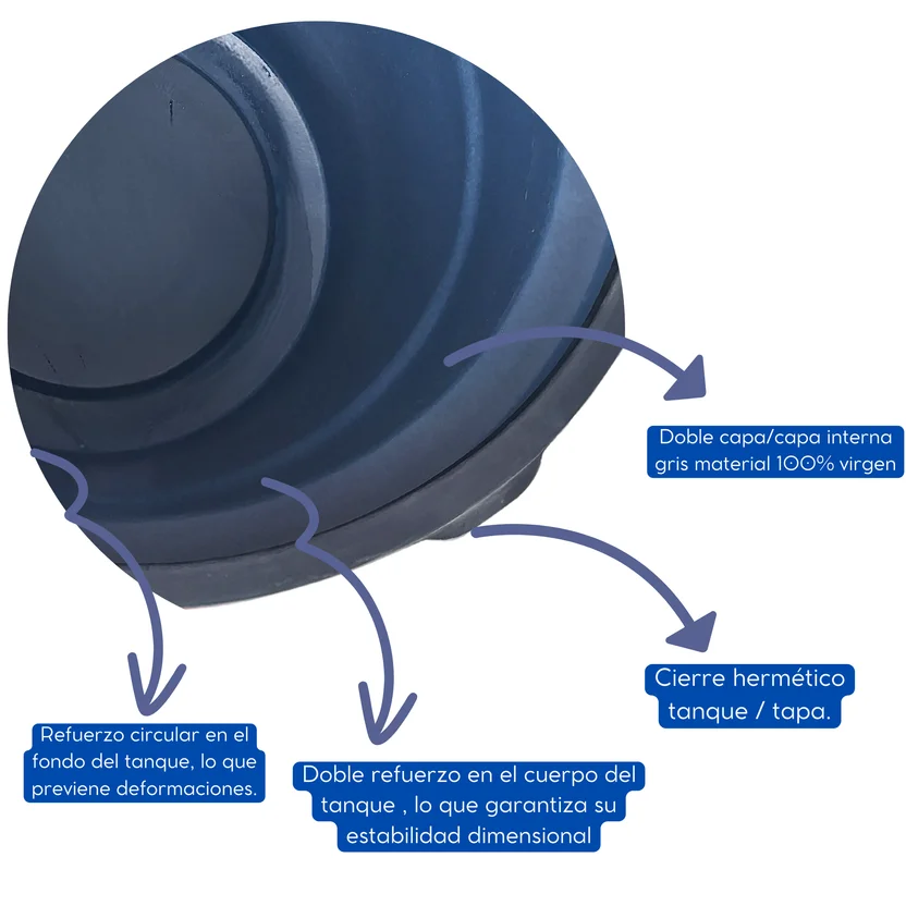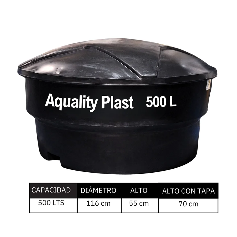 Características : Los tanques de agua AQUALITY PLAST son fabricados con el procesode rotomoldeo, utilizando como materia prima polietileno 100 % virgen.La materia prima utilizada cumple con la norma FDA 21 cfr 177.1520para contacto con alimentos y agua potable. Cierre hermético tanque / tapa, refuerzo circular en el fondo del tanque, lo que previene deformaciones.• Doble refuerzo en el cuerpo del tanque , lo que garantiza su estabilidad dimensional,Accesorios: 2 acoples macho de 1”, 1 acople hembra de 1 “, 1 acople machode ½ “ , 2 empaques caucho 1”y 1 empaque caucho ½”.